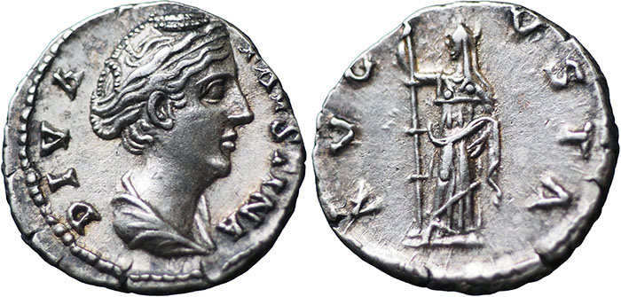 DIVVS FAUSTINA I. Wife of Antoninus Pius. Ar Denarius. AVGVSTA. Juno standing right, holding sceptre in right hand and lowering left. RSC 128. |