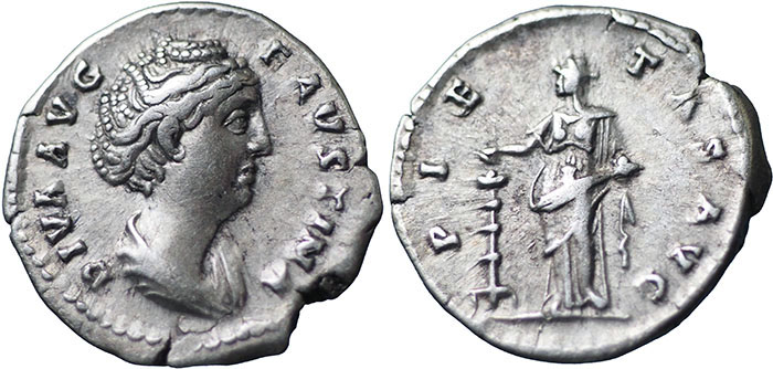DIVVS FAUSTINA I. Wife of Antoninus Pius. Ar Denarius. PIETAS AVG. Pietas, veiled, standing left, dropping incense on lighted candelabrum and holding box. RSC 237. |