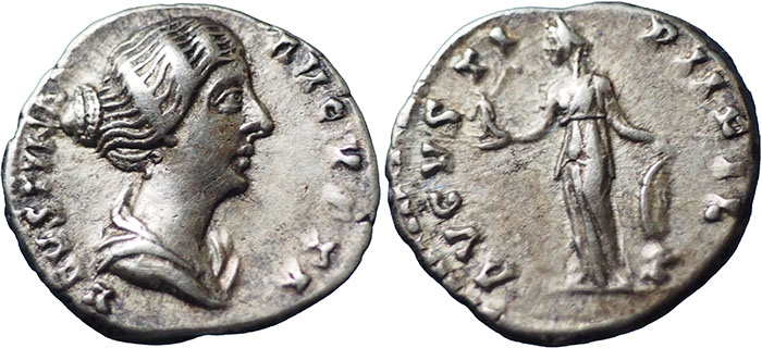 FAUSTINA II. Wife of Marcus Aurelius. Ar Denarius. AVGVSTI PII FIL. Venus standing left, holding Victory and resting left hand on shield set on helmet. RSC 15. |