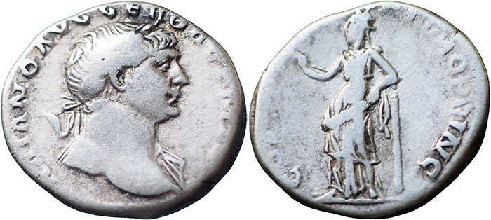 TRAJAN. 98-117 AD. Ar Denarius. COS V P P SPQR OPTIMO PRINC. Felicitas standing left, leaning on a column and holding caduceus. RSC 81b. |