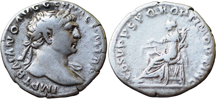 TRAJAN. 98-117 AD. Ar Denarius. COS V P P SPQR OPTIMO PRINC. Aequitas seated left, holding scales and cornucopiae. RSC 86. |