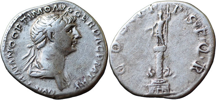 TRAJAN. 98-117 AD. Ar Denarius. COS VI P P SPQR OPTIMO PRINC. Trajan's column: statue of Trajan on a column and two eagles standing on a square base. RSC 115. Interesting historical type. |