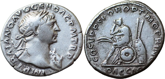 TRAJAN. 98-117 AD. Ar Denarius. DAC CAP in exergue, COS V P P SPQR OPTIMO PRINC. Dacian, wearing peaked cap, seated left on pile of arms, mourning; about him, two curved swords, two spears and an oblong shield. RSC 120. |