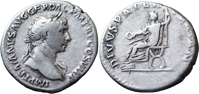 TRAJAN. 98-117 AD. Ar Denarius. DIVVS PATER TRAIAN. Trajan's father seated left on curule chair, holding patera and sceptre. RSC 140. Scarce type. |