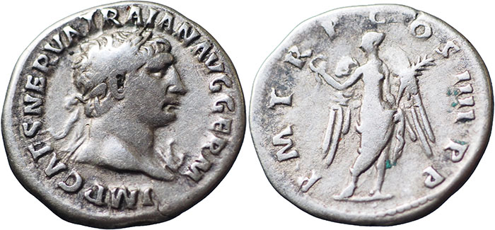 TRAJAN. 98-117 AD. Ar Denarius. P M TR P COS IIII P P. Victory, naked to waist, standing front, head left, holding wreath and palm. RSC 240b. |