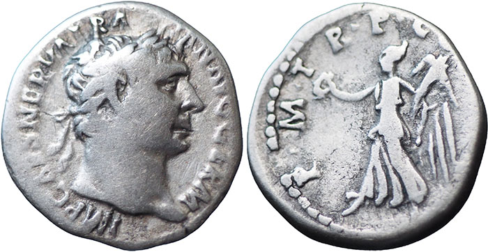 TRAJAN. 98-117 AD. Ar Denarius. P M TR P COS IIII P P. Victory, draped, advancing left, holding wreath and palm. RSC 242. |