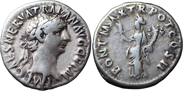 TRAJAN. 98-117 AD. Ar Denarius. PONT MAX TR POT COS II. Pax, draped and wearing wreath, standing left, holding branch and cornucopiae. RSC 292. |