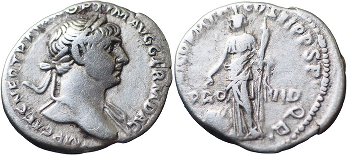 TRAJAN. 98-117 AD. Ar Denarius. PROVID across field, PARTHICO P M TR P COS VI P P SPQR around. Providentia standing left, holding sceptre; at her feet, a globe. RSC 314. |