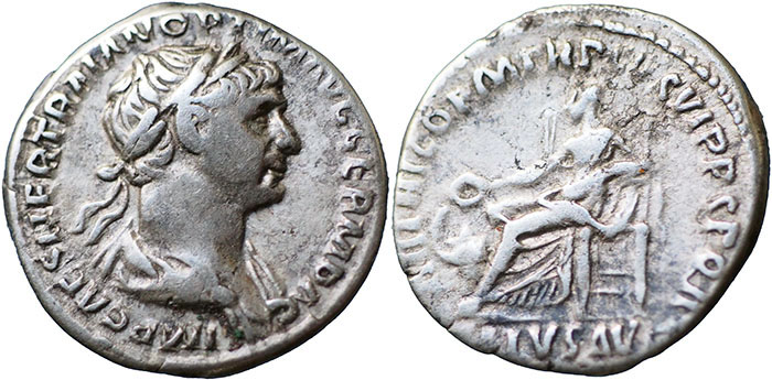 TRAJAN. 98-117 AD. Ar Denarius. SALVS AVG in exergue, PARTHICO P M TR P COS VI P P SPQR around. Salus seated left, feeding a serpent which is entwined around altar. RSC 332. |