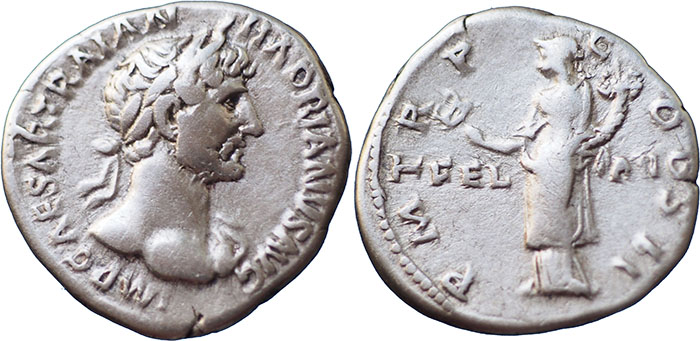 HADRIAN. 117-138 AD. Ar Denarius. FEL AVG across field, P M TR P COS II around. Felicitas, draped, standing left, holding caduceus and cornucopiae. RSC 595. |