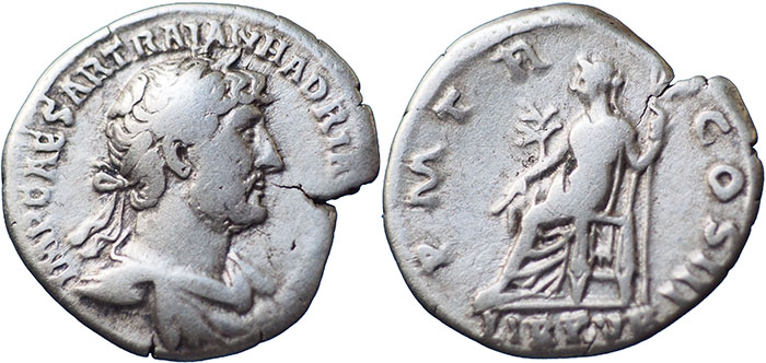HADRIAN. 117-138 AD. Ar Denarius. LIB PVB in exergue, P M TR P COS III around. Libertas seated left on throne, holding branch and sceptre. RSC 903a. |