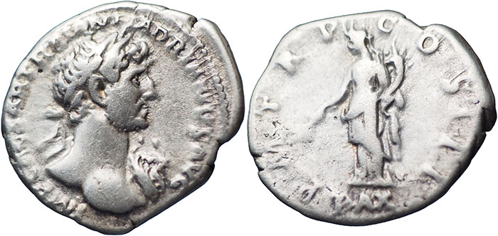 HADRIAN. 117-138 AD. Ar Denarius. PAX in exergue, P M TR P COS DES II around. Pax standing left, holding branch and cornucopiae. RSC 1015a. |