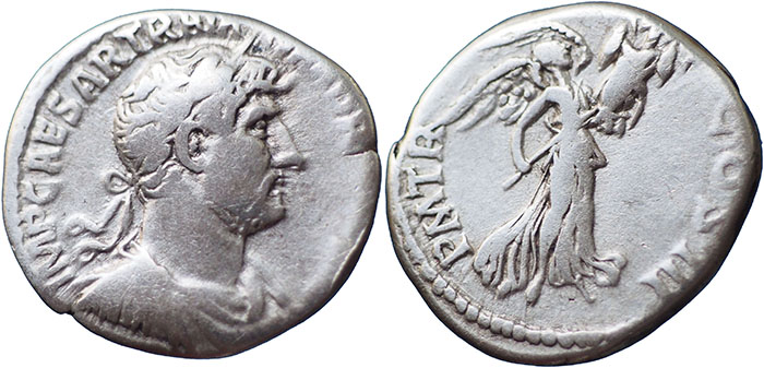 HADRIAN. 117-138 AD. Ar Denarius. P M TR P COS III. Victory, draped, flying right, holding trophy before her with both hands. RSC 1132a. |