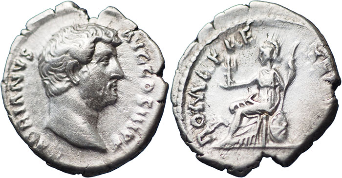 HADRIAN. 117-138 AD. Ar Denarius. ROMAE AETERNAE. Roma seated left on round shield, holding palladium and spear. RSC 1312. |