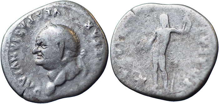 VESPASIAN. 69-79 AD. Ar Denarius. IOVIS CVSTOS. Jupiter, nude, facing, holding sceptre and patera, an altar at his feet. RSC 223. |