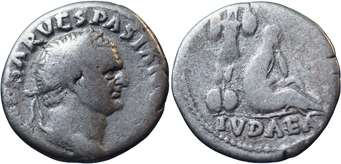 VESPASIAN. 69-79 AD. Ar Denarius. IVDAEA in exergue. Judaea or Jewess in attitude of mourning seated right before trophy. RSC 226. |