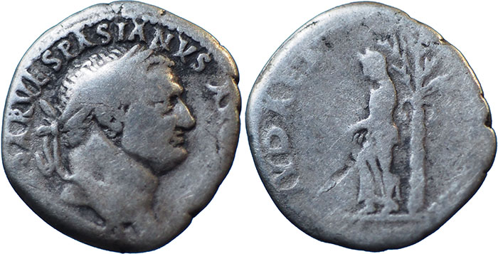 VESPASIAN. 69-79 AD. Ar Denarius. IVDAEA DEVICTA. Jewess standing left in front of palm hands bound in front of her. RSC 243. Rare. |