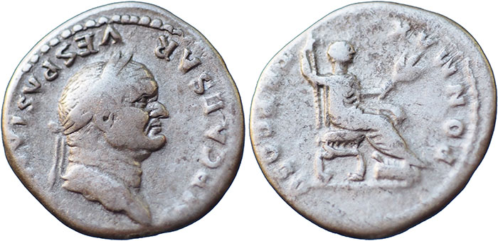 VESPASIAN. 69-79 AD. Ar Denarius. PON MAX TR P COS V. Vespasian seated right, holding branch and sceptre. RSC 364. |