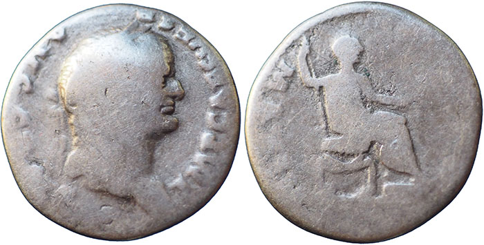 VESPASIAN. 69-79 AD. Ar Denarius. PONTIF MAXIM. Vespasian seated right, holding branch and sceptre. RSC 387. |