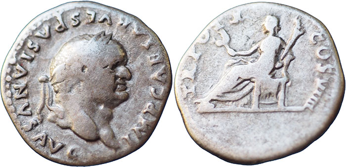 VESPASIAN. 69-79 AD. Ar Denarius. TR POT X COS VIIII. Ceres seated left, holding torch, corn-ear and poppy. RSC 550. |