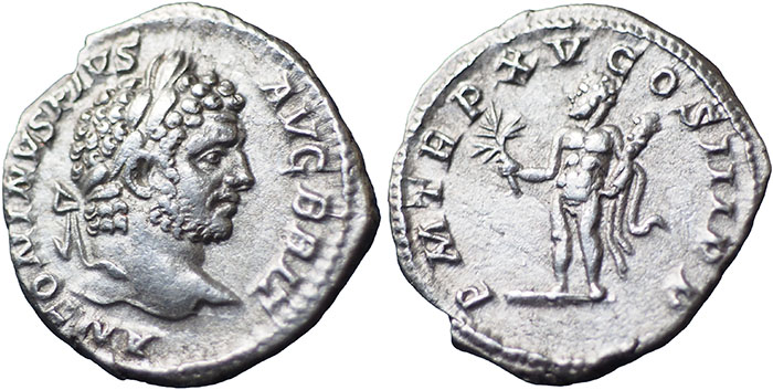 CARACALLA. 198-217 AD. Ar Denarius. P M TR P XV COS III P P. Hercules, naked, standing half-left, holding branch and club with lion's skin. RSC 196. British title in obverse legend. |