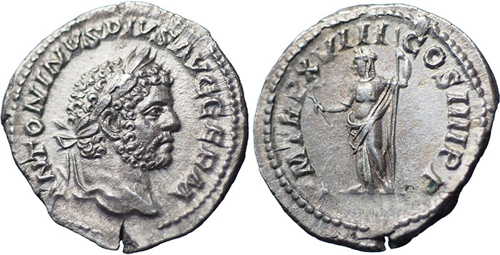 CARACALLA. 198-217 AD. Ar Denarius. P M TR P XVIII COS IIII P P. Pax standing half-left, holding branch and sceptre. RSC 314. |