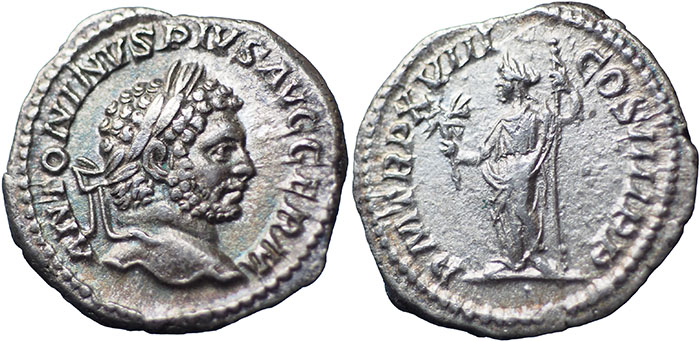 CARACALLA. 198-217 AD. Ar Denarius. P M TR P XVIII COS IIII P P. Pax standing half-left, holding branch and sceptre. RSC 314. |
