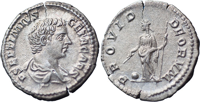GETA. 209-212 AD. Ar Denarius. PROVID DEORVM. Providentia, diademed, standing half-left, holding wand and sceptre, globe at feet. RSC 170. |