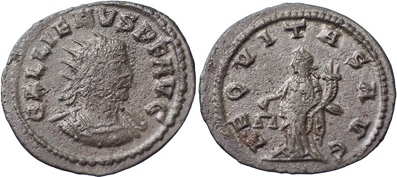 GALLIENUS. 253-268 AD. Billon Antoninianus. Mint of Antioch, Sole Reign. GALLIENVS PF AVG, radiate, cuirassed bust right. ® AEQVITAS AVG, Aequitas standing left, holding scales and cornucopiae. RSC 28. |