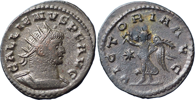 GALLIENUS. 253-268 AD. Billon Antoninianus. Mint of Antioch, Sole Reign. GALLIENVS PF AVG, radiate, cuirassed bust right. ® VICTORIA AVG, Victory walking left; star in field. RIC V-1, 662. RSC 1098. Toned. |