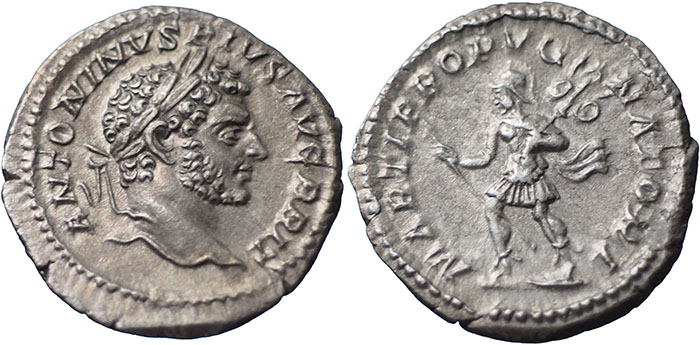 CARACALLA. 198-217 AD. Ar Denarius. MARTI PROPVGNATORI. Mars, in military dress, hurrying left, holding spear and trophy. RSC 150. |