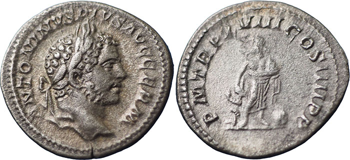CARACALLA. 198-217 AD. Ar Denarius. P M TR P XVIII COS IIII P P. Aesculapius standing front, head left, holding serpent-entwined wand; globe on ground right. RSC 302. |