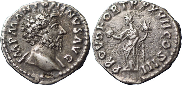 MARCUS AURELIUS. 161-180 AD. Ar Denarius. PROV DEOR TR P XVII COS III. Providentia standing left, holding globe and cornucopiae. RSC 526a. |