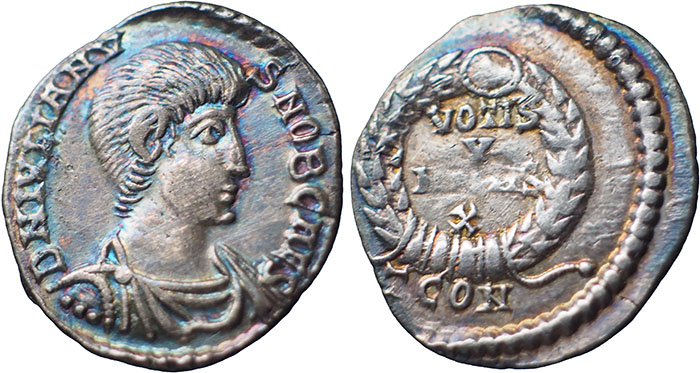 JULIAN. 360-363 AD. Ar Siliqua. As Caesar. DN IVLIANVS NOB CAES, draped, cuirassed, right. VOTIS V MVLTIS X legend in four lines within laurel wreath. Mintmark TCON (Arelate). RSC 154b. 18mm. Attractive piece with Good metal and old cabinet tone. |