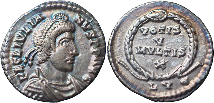 JULIAN. 360-363 AD. Ar Siliqua. FL CL IVLIANVS PP AVG, draped, cuirassed, pearl diadem, right. ® VOTIS V MVLTIS X, legend in four lines within laurel wreath. Mintmark LVG (Lugdunum). RSC 163a. 17mm. Attractive piece with Good metal and old cabinet tone. |