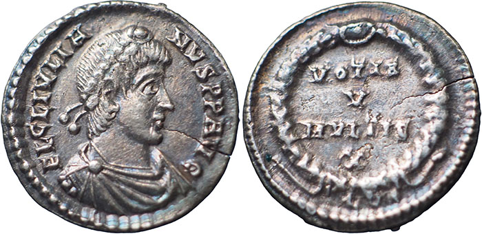 JULIAN. 360-363 AD. Ar Siliqua. FL CL IVLIANVS PP AVG, draped, cuirassed, pearl diadem, right. ® VOTIS V MVLTIS X, legend in four lines within laurel wreath. Mintmark PLVG (Lugdunum). RSC 163b. 17.5mm. Striking split at 4 o'clock but still an attractive piece with Good metal and old cabinet tone. |