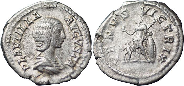 PLAUTILLA. Wife of Caracalla. Ar Denarius. VENVS VICTRIX. Venus, naked to waist, standing half-left, holding apple and palm; at side, shield; before, cupid standing, holding helmet. RSC 25. |