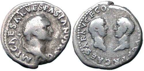 VESPASIAN, TITUS & DOMITIAN. 70 AD. Ar Denarius. IMP CAESAR VESPASIANVS AVG. Laureate bust of Vespasian right . ® CAESAR AVG F COS CAESAR AVG F PR. Heads of Titus & Domitian facing each other. RSC 5. |