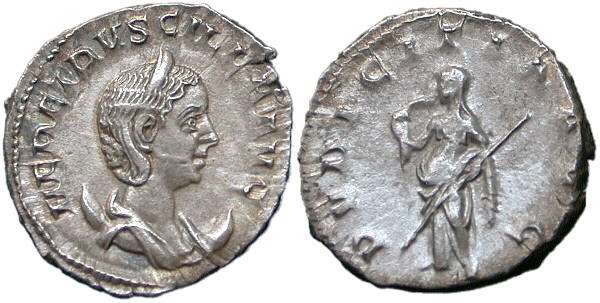 HERENNIA ETRUSCILLA. Wife of Trajan Decius. Ar Antoninianus. PVDICITIA AVG. Pudicitia standing left, holding sceptre and right hand drawing veil. RSC 17. |
