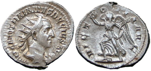 TRAJAN DECIUS. 249-251 AD. Ar Antoninianus. VICTORIA AVG. Victory running left, holding wreath and palm. RSC 113a. |
