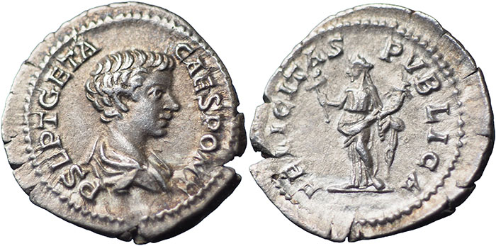 GETA. 209-212 AD. Ar Denarius. FELICITAS PVBLICA. Felicitas standing half-left, holding caduceus and cornucopiae. RSC 38a. |