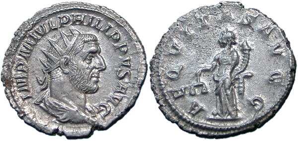 PHILIP I. 244-249 AD. Ar Antoninianus. AEQVITAS AVGG. Aequitas standing left holding scales and cornucopiae. RSC 9. |