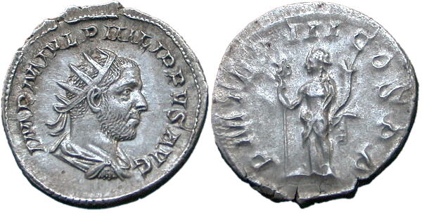 PHILIP I. 244-249 AD. Ar Antoninianus. P M TR P III COS P P. Felicitas standing left holding caduceus and cornucopiae. RSC 124. |