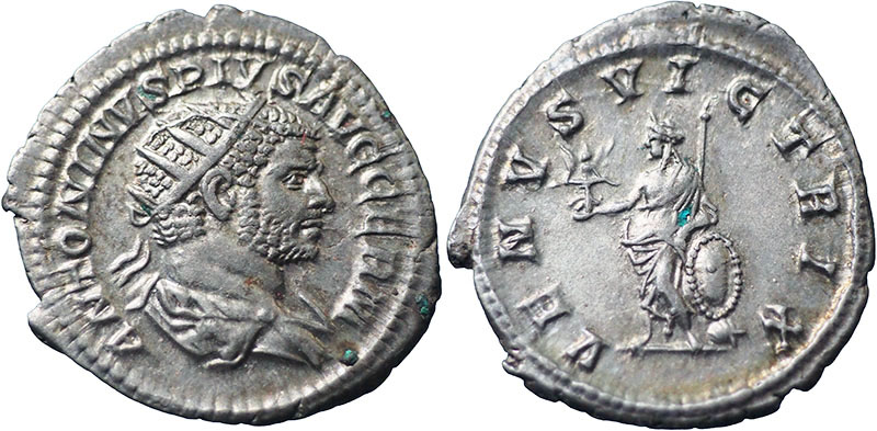 CARACALLA. 198-217 AD. Ar Antoninianus. VENVS VICTRIX. Venus standing half-left, holding Victory and sceptre and leaning on shield set on helmet. RSC 608c. |