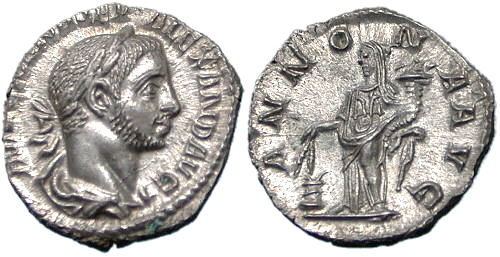 SEVERUS ALEXANDER. 222-235 AD. Ar Denarius. ANNONA AVG. Annona standing front, head left, holding corn-ears and cornucopiae; at her feet left, modius filled with corn-ears. RSC 23. |