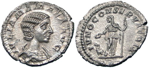 JULIA MAMAEA. Mother of Severus Alexander. Ar Denarius. IVNO CONSERVATRIX. Juno diademed and veiled, standing half-left, holding patera and sceptre; at feet, peacock standing half-left, turning head back to catch drops out of patera. RSC 35. |