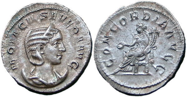 OTACILIA SEVERA. Wife of Philip I. Ar Antoninianus. CONCORDIA AVGG. Concordia seated left, holding patera and double cornucopiae. RSC 4. |