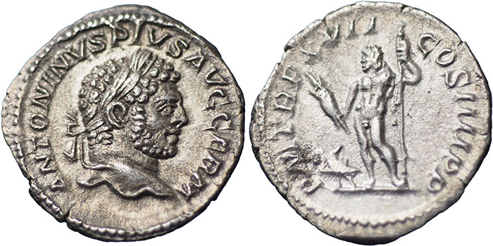 CARACALLA. 198-217 AD. Ar Denarius. P M TR P XVII COS IIII P P. Jupiter, naked, but for cloak on shoulder, standing half-left, holding thunderbolt and long sceptre, eagle at feet. RSC 239. |