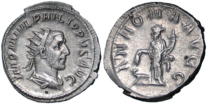 PHILIP I 244-249 AD. Ar Antoninianus. ANNONA AVGG. Annona standing half-left, holding cornucopiae and ears of corn over prow. RSC 32. |