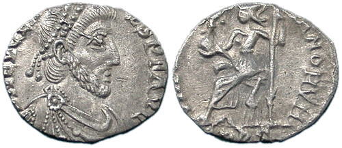 EUGENIUS. 392-394 AD. Ar Siliqua. DN EVGENIVS PF AVG, diademed, draped bust right. ® VIRTVS ROMANORVM, Roma seated left on cuirass. mm MDPS (Milan). 1.1g. RSC 14b. |